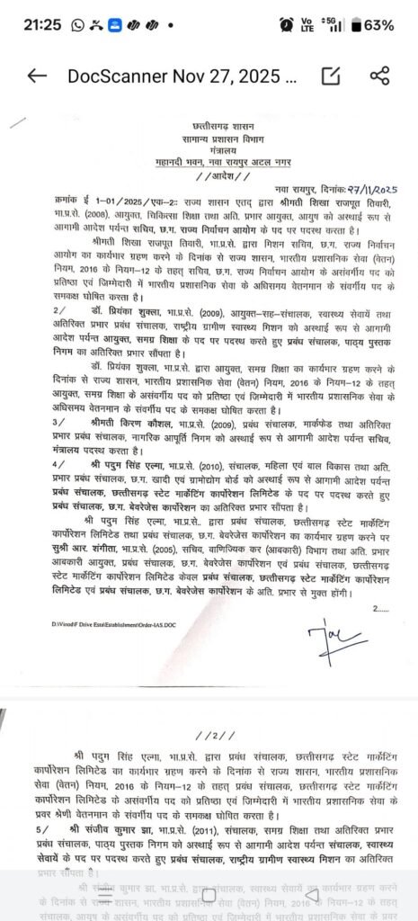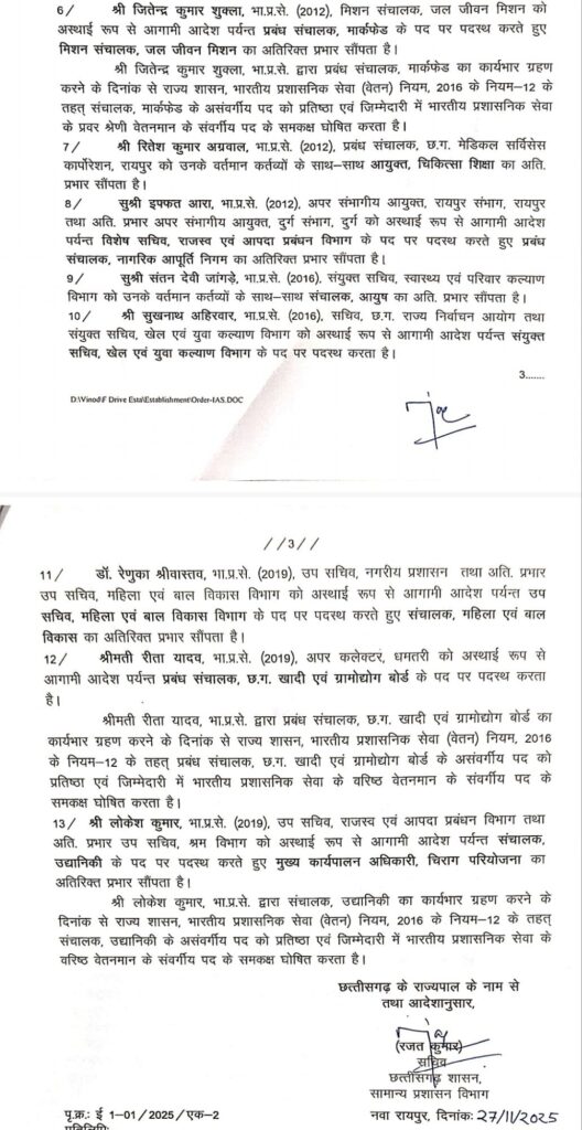 राज्य सरकार ने आज एक आदेश में छत्तीसगढ़ शासन के 13 आईएएस अफसरो के विभागों में बदलाव करते हुए नई पदस्थापना दी है साथ ही कुछ अफसर की वेतन वृद्धि भी की गई है। देखिए पूरी सूची :