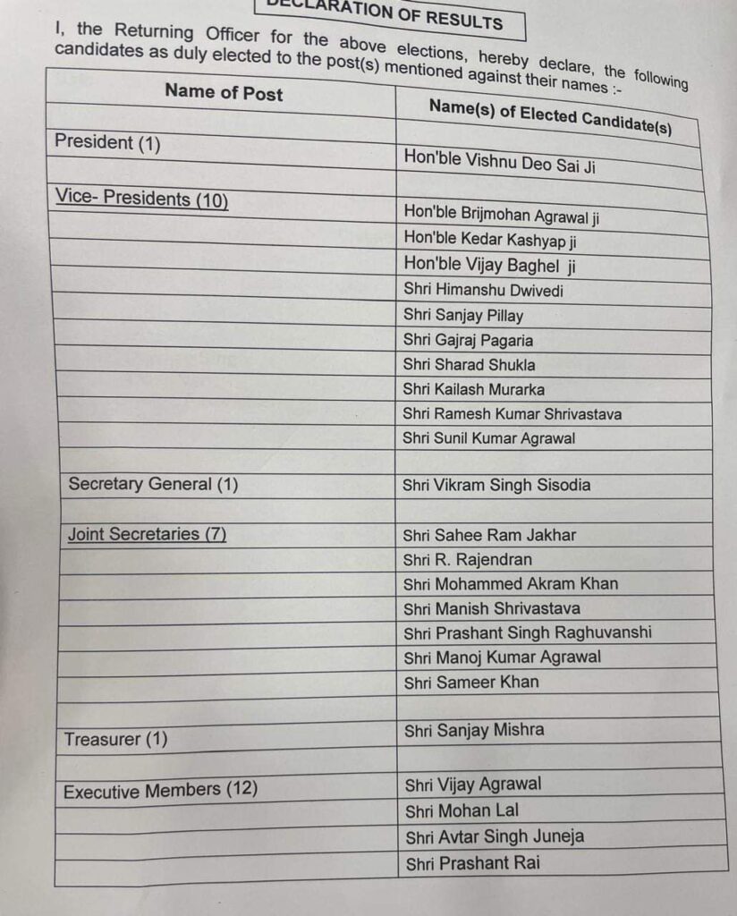 ब्रेकिंग : मुख्यमंत्री विष्णु देव साय छत्तीसगढ़ ओलंपिक एसोसिएशन के नए अध्यक्ष निर्वाचित, महासचिव विक्रम सिंह सिसोदिया बने, सांसद बृजमोहन अग्रवाल वरिष्ठ उपाध्यक्ष, देखिए पूरी कार्यकारिणी
