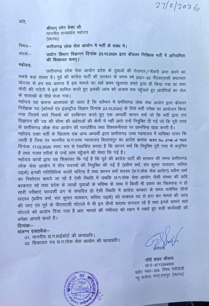 ब्रेकिंग : पीएससी सदस्य प्रवीण वर्मा, संत कुमार पासवान, सरिता उइके की राज्यपाल से शिकायत, भ्रष्टाचार का आरोप, बॉयलर निरीक्षक भर्ती में हुई गड़बड़ी, अदालती आदेश से पुष्टि, भाजपा नेता गौरी शंकर श्रीवास ने उठाया मामला