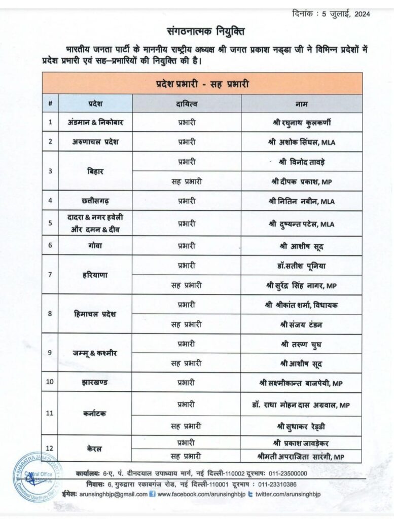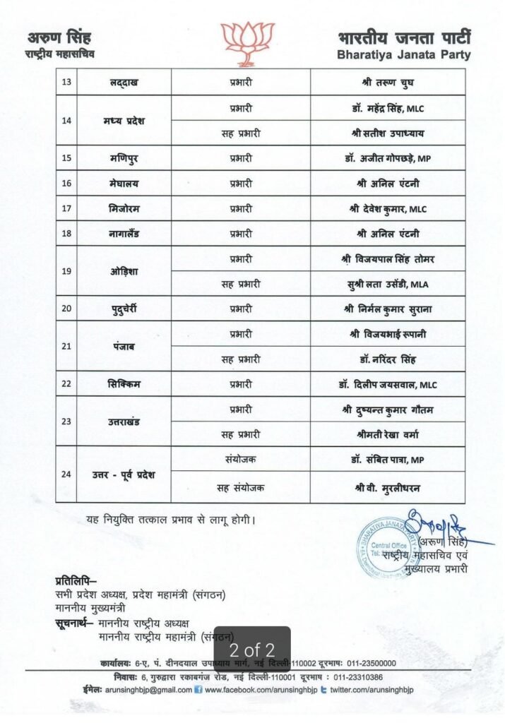 ब्रेकिंग : प्रदेश भाजपा के नए प्रभारी घोषित, लता उसेण्डी बनाई गई सह प्रभारी, देखिए पूरी सूची और खबर