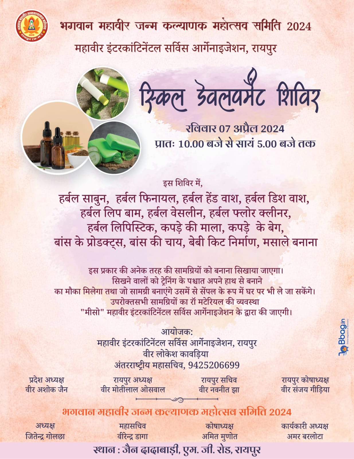 आयोजन : स्किल डेवलपमेंट शिविर 7 अप्रैल से, महावीर इंटरकांटिनेंटल सर्विस आर्गेनाइजेशन देगा नि:शुल्क प्रशिक्षण, भगवान महावीर जन्म कल्याणक महोत्सव समिति का सहयोग